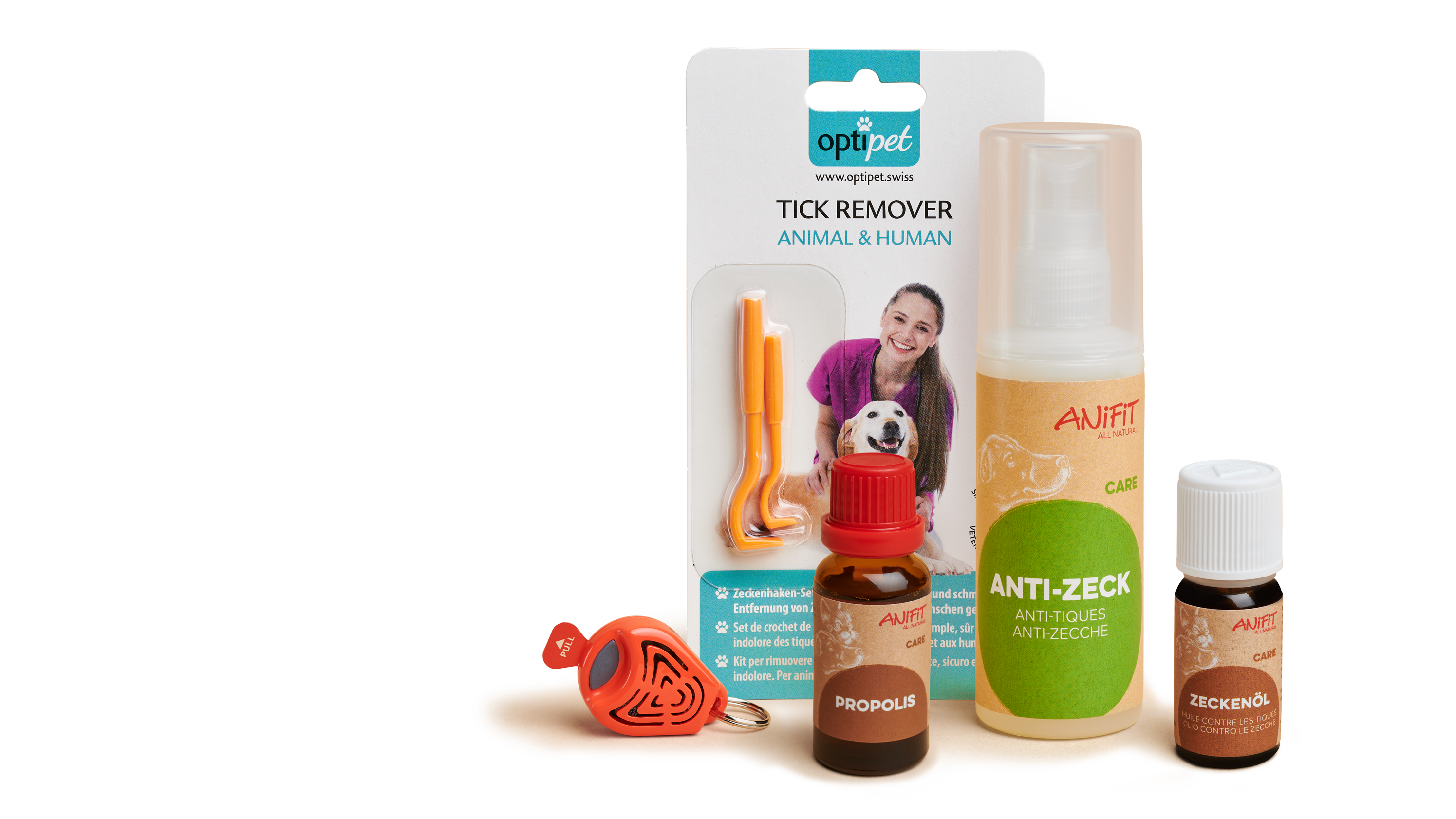 ANiFiT bietet verschiedene, natürliche Mittel zum Schutz vor Zecken an: Das Zeckenöl für Hunde und Katzen wird äusserlich aufgetragen. Die Inhaltsstoffe dringen in den Organismus ein und wirken dann von innen heraus. Es muss anfangs regelmässig aufgetragen werden und entfaltet dann eine Wirkung, die mehrere Wochen anhält. Der Zeckenspray für Hunde wird äusserlich vor jedem Spaziergang angewendet. Die wiederaufladbaren Tickless-Anhänger für Hunde und Katzen senden Ultraschallimpulse aus, die die Zecken fernhalten. Sollte dennoch eine Zecke zustechen, hilft der Zeckenhaken beim sicheren Entfernen und Propolis pflegt die betroffene Stelle.